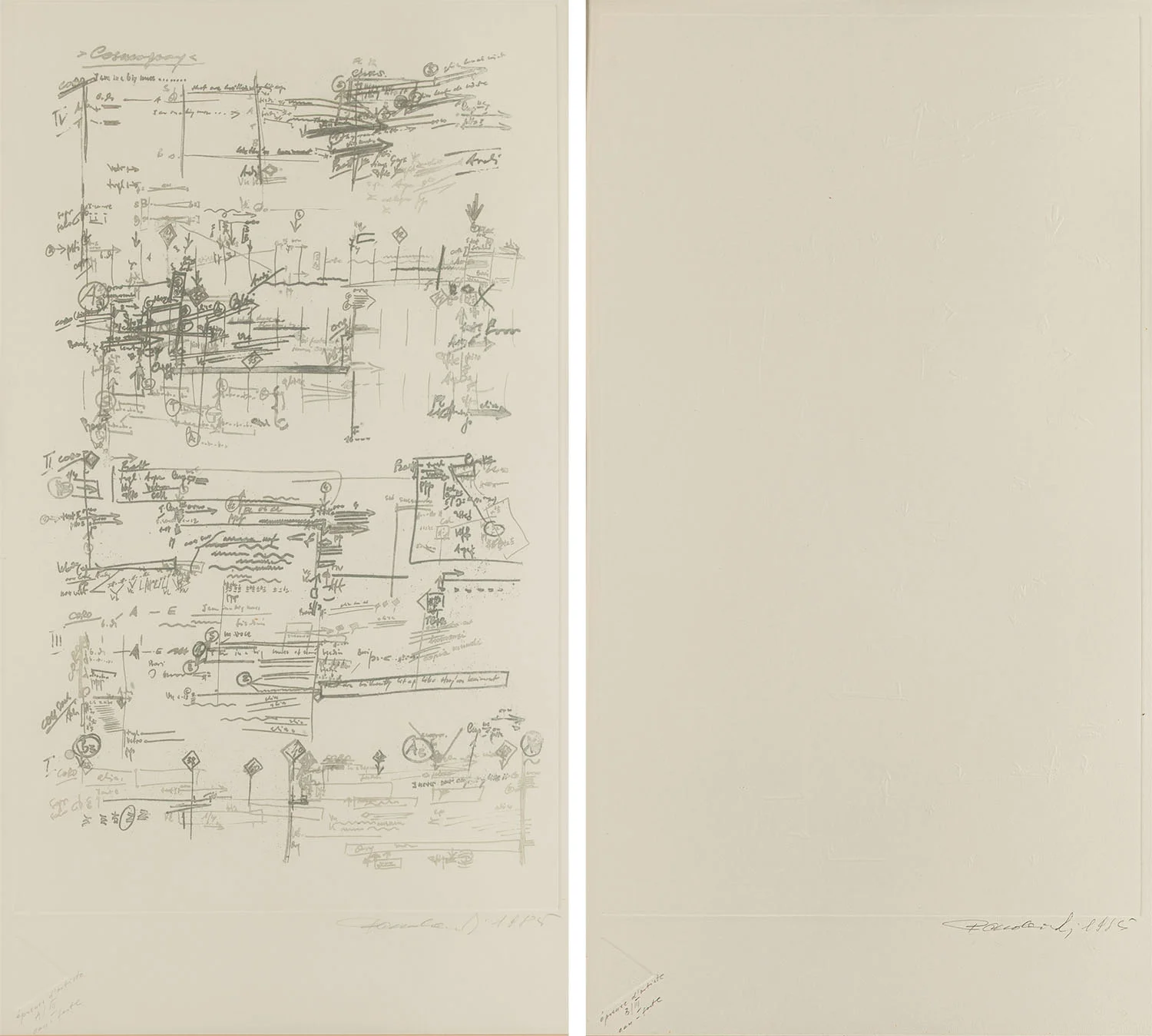 Szczególne znaczenie ma dyptyk "Kosmogonia nr A i B/III/33", w którym zastosowano odmienne techniki wykonania. Jedna z grafik została wykonana w technice akwaforty z akwatintą, umożliwiającej uzyskanie subtelnych przejść tonalnych, zróżnicowanej gęstości i kontrastów, druga natomiast w technice gaufrage, czyli suchego tłoku, gdzie znak ujawnia się nie poprzez linię czy kolor, lecz poprzez relief, światło i cień. Zestawienie tych technik podkreśla dwoistość samej idei zapisu: obecność i nieobecność, dźwięk i ciszę, zapis i potencję zapisu. Szczególnie wymowna staje się pusta pięciolinia – znak nieskończonej możliwości, przestrzeń jeszcze nienazwanego brzmienia.