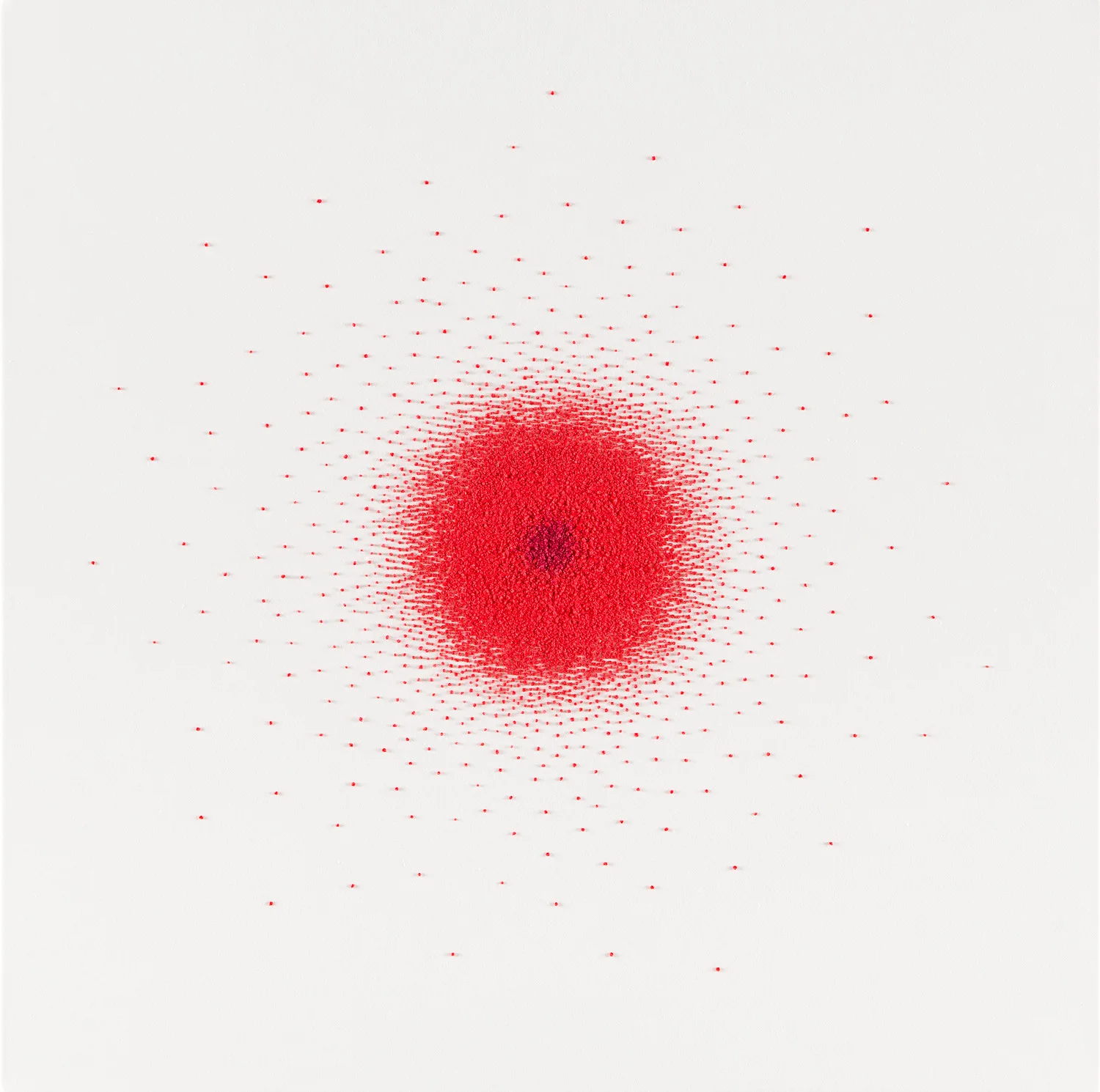 W pracy "Bez tytułu (Startled Star)" Piotr Uklański wykorzystuje haft na płótnie, świadomie sięgając po medium, które zwykle kojarzone jest z domowym rzemiosłem i powtarzalnością gestu. Wybór techniki haftu wprowadza do dzieła wymiar fizycznej obecności materii, odmienny od ekspresji pędzla. Uklański rozgrywa tu napięcie pomiędzy delikatnością tkaniny a precyzją, a zarazem surowością ściegu, który w jego ujęciu zyskuje charakter radykalnie nowoczesny. Delikatność haftu zestawiona z monumentalnym symbolem gwiazdy tworzy napięcie między intymnością a spektaklem, charakterystyczne dla strategii artystycznej Uklańskiego, który często demistyfikuje współczesne mity oraz kwestionuje utarte kody wizualne.
