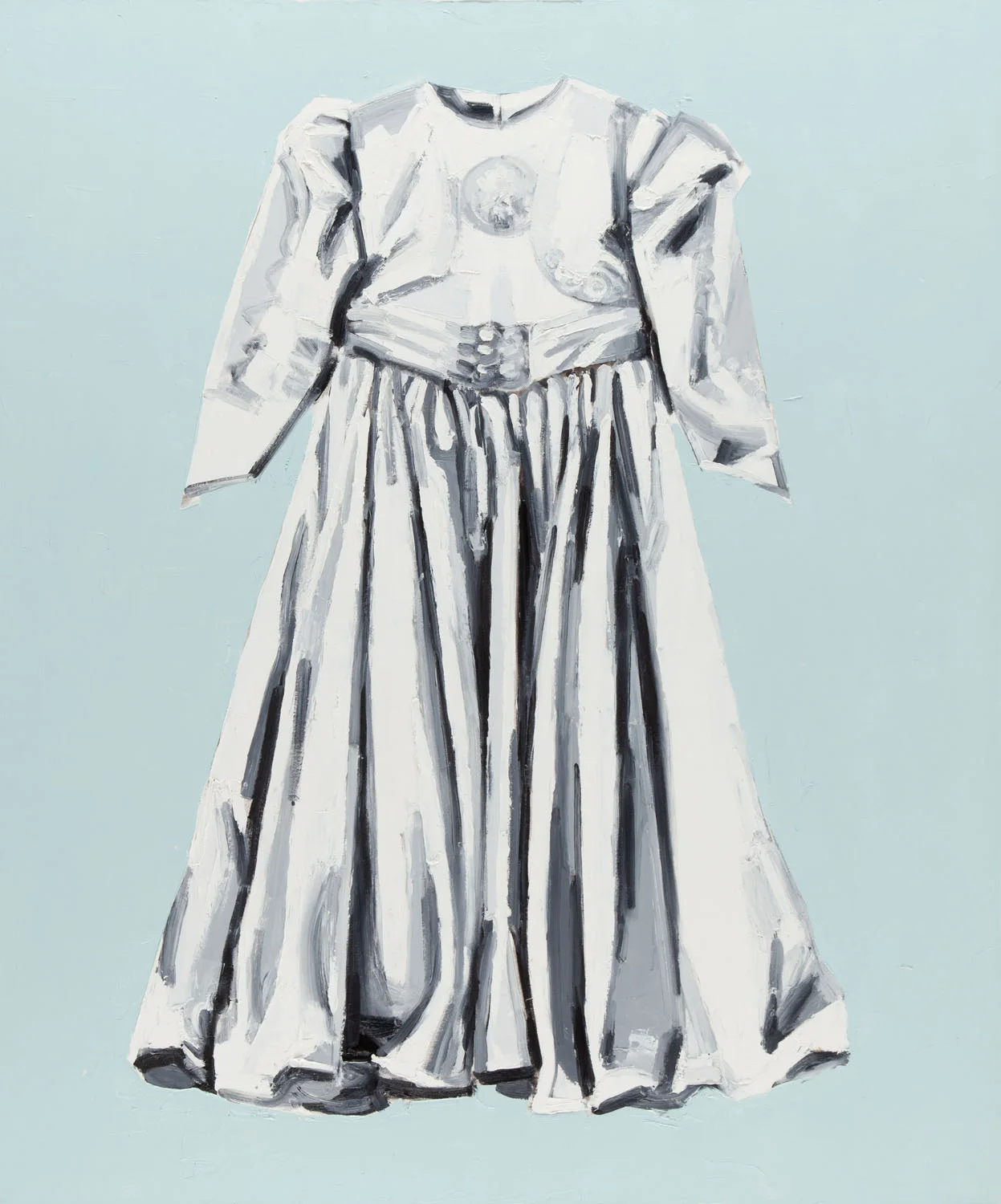Obraz Sukienka Jadwigi Sawickiej wpisuje się w jej charakterystyczny sposób pracy z językiem i przedmiotem, lecz dodatkowo wprowadza niezwykle ciekawy wątek materialności. Sawicka od lat bada napięcie między słowem a obrazem, między komunikatem a rzeczą. W przypadku Sukienki motyw ubrania, przedmiotu intymnego, bliskiego ciału staje się powierzchnią dla słowa, które nabiera przez to niemal cielesnej siły. Sukienka, jako element garderoby, niesie konotacje kobiecości, ekspresji, ale też społecznych oczekiwań. Sawicka, przenosząc ją na obraz, "odmaterialnia" przedmiot, a jednocześnie zachowuje jego symboliczny ciężar. Malarska tkanina staje się miejscem napięcia – między tym, co prywatne, a tym, co komunikowane publicznie; między rolą społeczną a intymnym doświadczeniem jednostki. Choć nie jest to fizyczna tkanina jak u Bereś czy Kowalewskiej, Sukienka Sawickiej doskonale pokazuje, jak w sztuce współczesnej sam motyw materiału lub ubrania może być formą krytycznego komentarza, narzędziem analizy społecznej i nośnikiem emocji.
