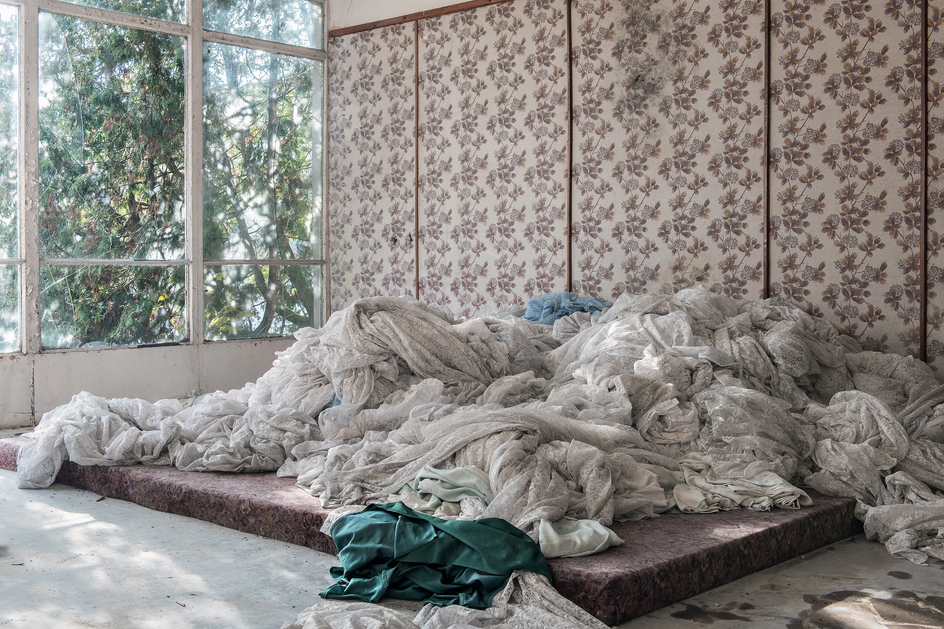 W przypadku Karola Pałki sprawa jest nieco inna – choć nie operuje on stricte tkaniną, materiał (w sensie fizycznym) pojawia się w kontekście jego fotografii i koncepcji przestrzeni. Pałka jest znany z cyklu "Gmach", w którym dokumentuje wnętrza postsocjalistycznej architektury, są to często opuszczone budynki hotelowe czy schrony. Choć Karol Pałka nie tworzy z tekstyliów, materia odgrywa kluczową rolę w jego fotograficznej praktyce. Jego cykle, zwłaszcza te poświęcone architekturze przejściowej, opuszczonej lub "przemęczonej czasem", zyskują dodatkową siłę dzięki świadomemu wyborowi jakościowego papieru o wyraźnej fakturze. Papier, którego używa, często o strukturze zbliżonej do płótna staje się dopełnieniem tematu. Materia nośnika odpowiada materii przedstawienia: sfatygowane ściany, stare faktury, ślady użytkowania budynków rezonują z materialnością samej odbitki. To subtelny, ale znaczący dialog między medium a opowieścią o przemijaniu.