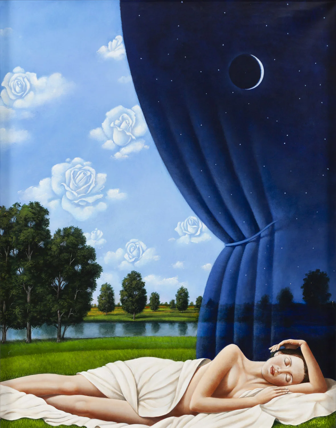 W latach 90. coraz większą rolę w twórczości Olbińskiego zaczęło odgrywać malarstwo, pozostając przy tym w ścisłej ciągłości z jego wcześniejszym dorobkiem ilustratorskim. Zarówno w ilustracji, jak i na płótnie artysta posługuje się językiem metafory, tworzy obrazy o idealnie uporządkowanej kompozycji i subtelnie zdeformowanej rzeczywistości: morze i ziemia zwijają się jak materiał, ptaki przysiadają na korzeniach drzew pod powierzchnią ziemi, a ludzie stapiają się z pejzażem. Tym fantastycznym wizjom towarzyszy spokój, harmonia barw oraz neoklasyczna elegancja postaci. Kobieta – częsty motyw w twórczości Rafała Olbińskiego – przedstawiana jest jako figura władcza, świadoma swojej wartości, pozbawiona jednak agresywnego erotyzmu.
