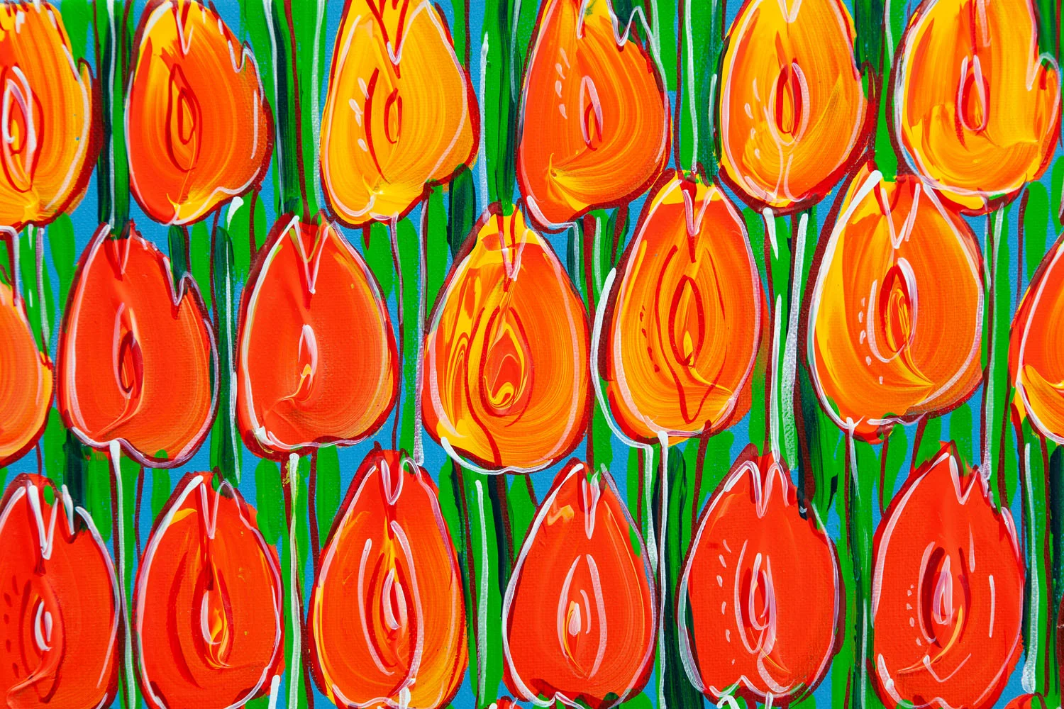Treść erotyczną, jednak w zupełnie innym wydaniu, przedstawia również kolejny obraz Dwurnika. Są to prezentowane tutaj "Pomarańczowe tulipany" z 2018 roku, które również zostaną zlicytowane na aukcji ATR OUTLET – Sztuka Współczesna. Motyw tulipanów jest jednym z bardziej rozpoznawalnych w twórczości Edwarda Dwurnika. Artysta malował je pojedynczo lub wypełniał nimi gęsto całe pole obrazowe, przedstawiając je w równych rzędach, jeden pod drugim. Najczęściej malowane były w intensywnych kolorach: w czerwieni, rzadziej w odcieniach żółcieni oraz okazjonalnie w błękitach. Niekiedy malarz posługiwał się dodatkowo impastową fakturą za pomocą której podkreślał sensualny charakter motywu. Artysta przez wiele lat przedstawiał wybrane kwiaty na różne sposoby i prezentował ich kolejne warianty.