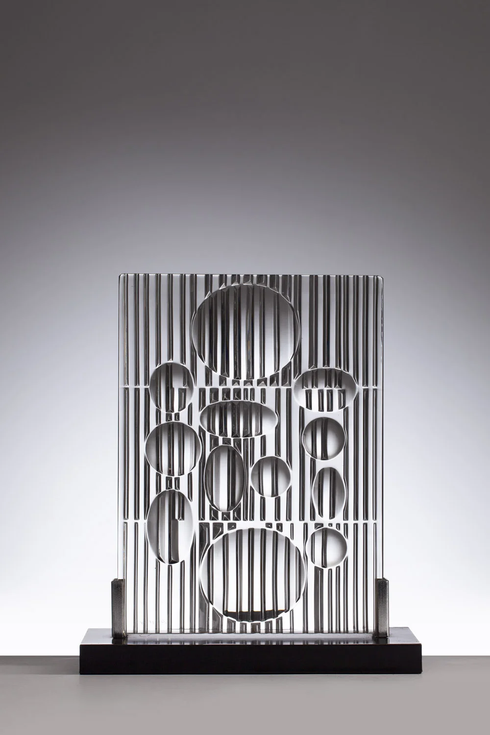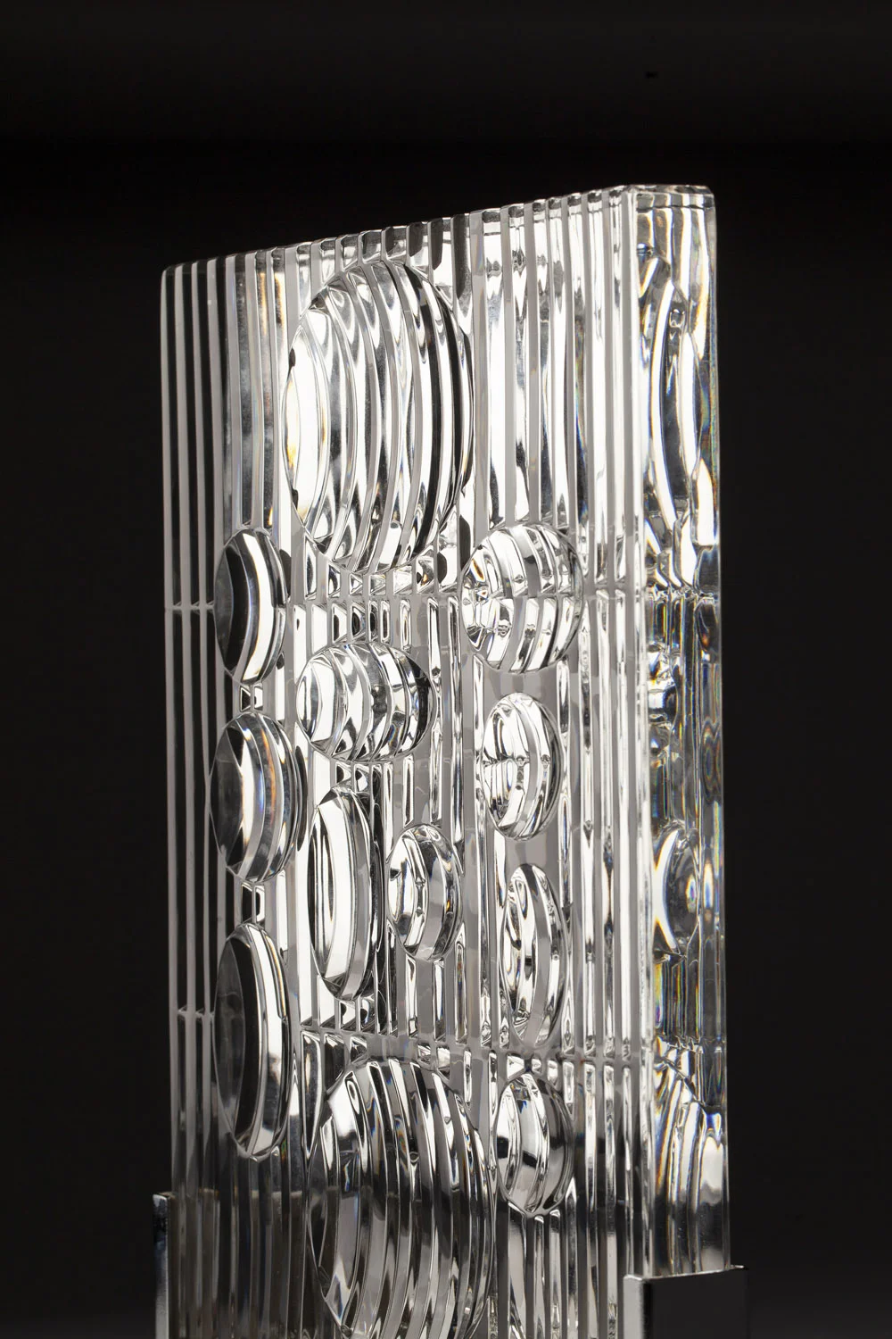 Efekt iluzji optycznej budowany jest w tym przypadku za pomocą warstwowego opracowania szklanej płyty. Żłobienia układają się w formy działających jak soczewki wypukłych i wklęsłych pól. Sposób opracowania wzoru w momencie zmiany punktu widoku nieustannie się zmienia, co buduje wrażenie ruchu. Analogiczny egzemplarz znajduje się od 2014 w zbiorach angielskiego British Museum. Projekt wystawiany był jako eksponat muzealny podczas przekrojowej wystawy poświęconej modernistycznej myśli projektowej ("Modern design and graphics: a selection of objects and prints from post-war Europe in the British Museum", 12 listopada 2016- 22 stycznia 2017, British Museum, Londyn).