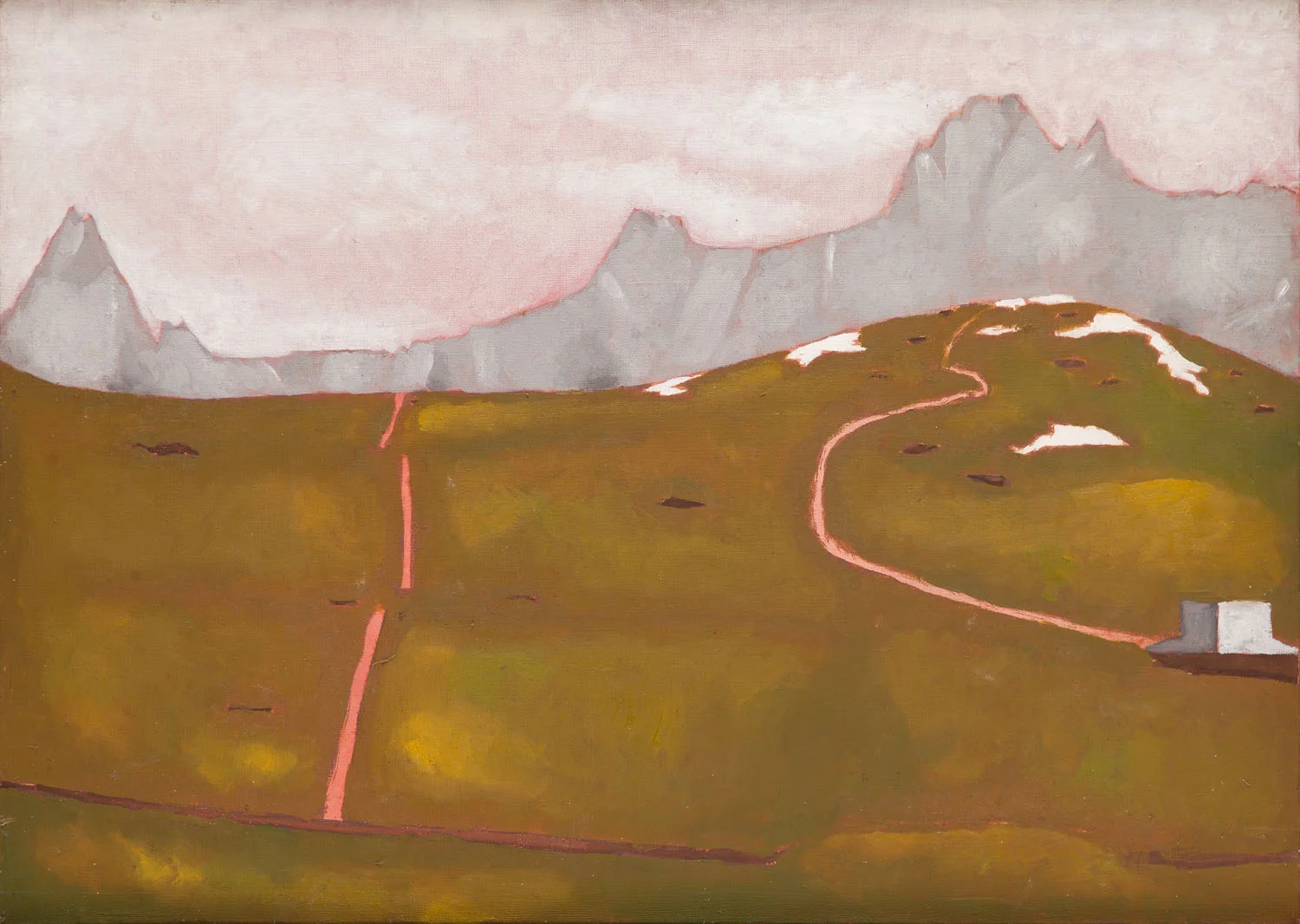 Nie inaczej jest w przypadku prezentowanego płótna, namalowanego najprawdopodobniej w rezultacie pleneru malarskiego, zorganizowanego przez Nowosielskiego dla swoich studentów z krakowskiej ASP w 1974 roku. Brunatne, ledwo pokryte śniegiem wzgórze sugeruje porę roku: wiosnę lub jesień, kiedy to wzgórza są wilgotne i błotniste, pokryte plackami śniegu jedynie na szczytach, a niebo pokryte jest szczelnie warstwą szarych chmur. W przeciwieństwie do pejzaży miejskich, w których można rozpoznać elementy perspektywy linearnej, w "Pejzażu z Harendy" mamy do czynienia raczej z aluzją do renesansowej perspektywy powietrznej. Kolejne plany – brunatnego wzgórza poprzecinanego liniami dróżek, skalistych szczytów Tatr oraz partia tła, czyli chmur – odwzorowane są wedle gradacji temperatury barw, od najcieplejszych do najchłodniejszych. Jednocześnie jednak, każda z partii opracowana jest w sposób płaszczyznowy, rudymentarny, a poszczególne plany oddzielone są od siebie ostro, bez efektu sfumato. Statyczna, horyzontalna kompozycja poprzez sposób kadrowania przypomina klasyczną pocztówkę. Może też kojarzyć się z pracami tzw. malarzy naiwnych, w tym innego słynnego Łemka – Nikifora Krynickiego, czyli Epifana Drowniaka, z którym Nowosielski nawet wystawiał. Choć góry, szczególnie w twórczości Nowosielskiego, kojarzą się z miejscem świętym, najbliższym niebu, miejscem łączności między światami, to jednak w przypadku prezentowanej pracy zdają się raczej miejscem wytchnienia, spokoju – ale bardzo realnym, "ziemskim", skojarzonym raczej z czystą przyjemnością krajoznawczej wędrówki aniżeli z miejscem duchowego uniesienia.