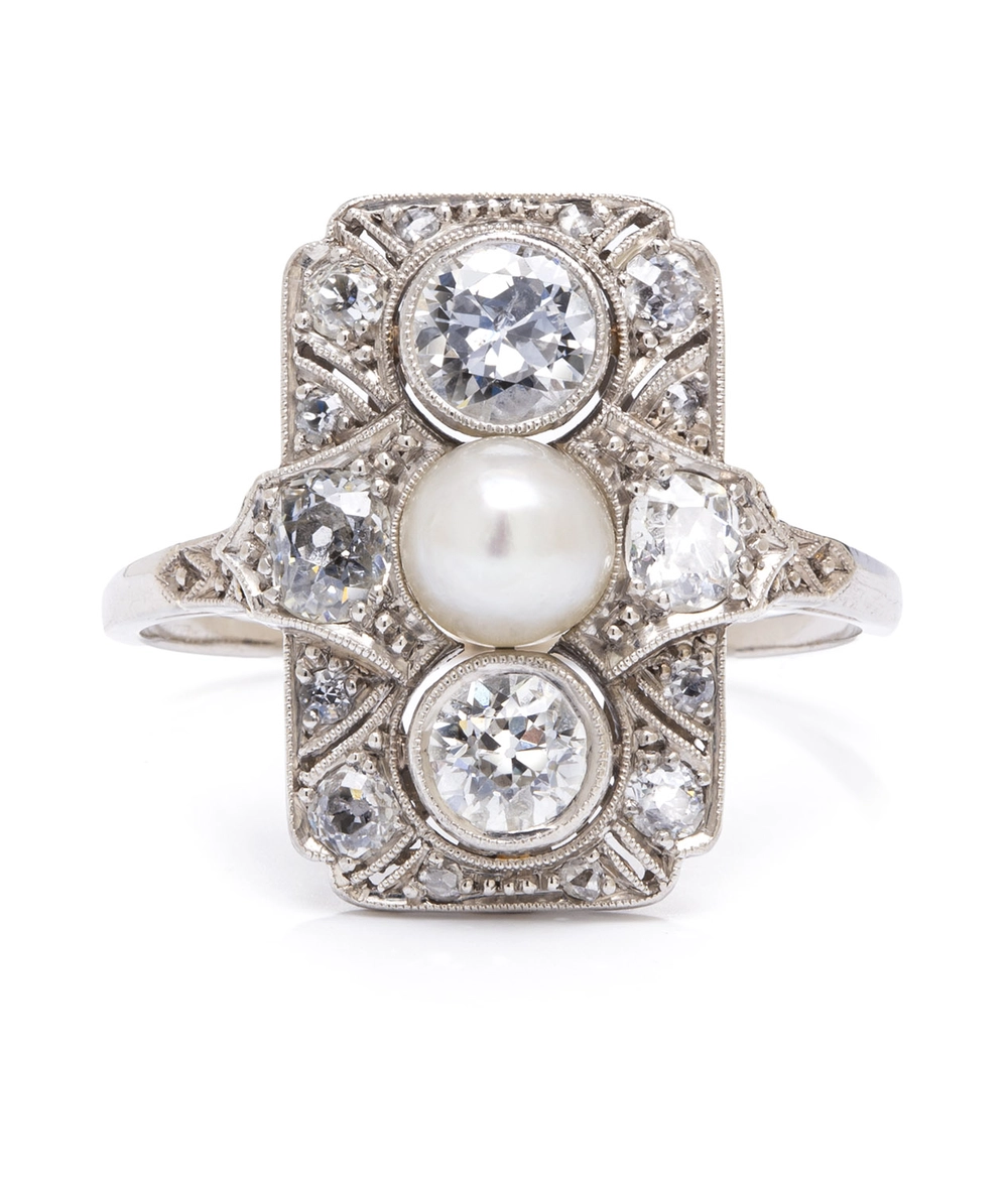 platyna pr. ~ 0,950, 4 brylanty w starym szlifie ł. ~ 1,20 ct I/SI-P, 12 brylantów i rozet diamentowych ł. ~ 0,28 ct I/VS, 1 perła naturalna o śr.: 5,5 mm, masa: 4,80 g, rozmiar: 22*