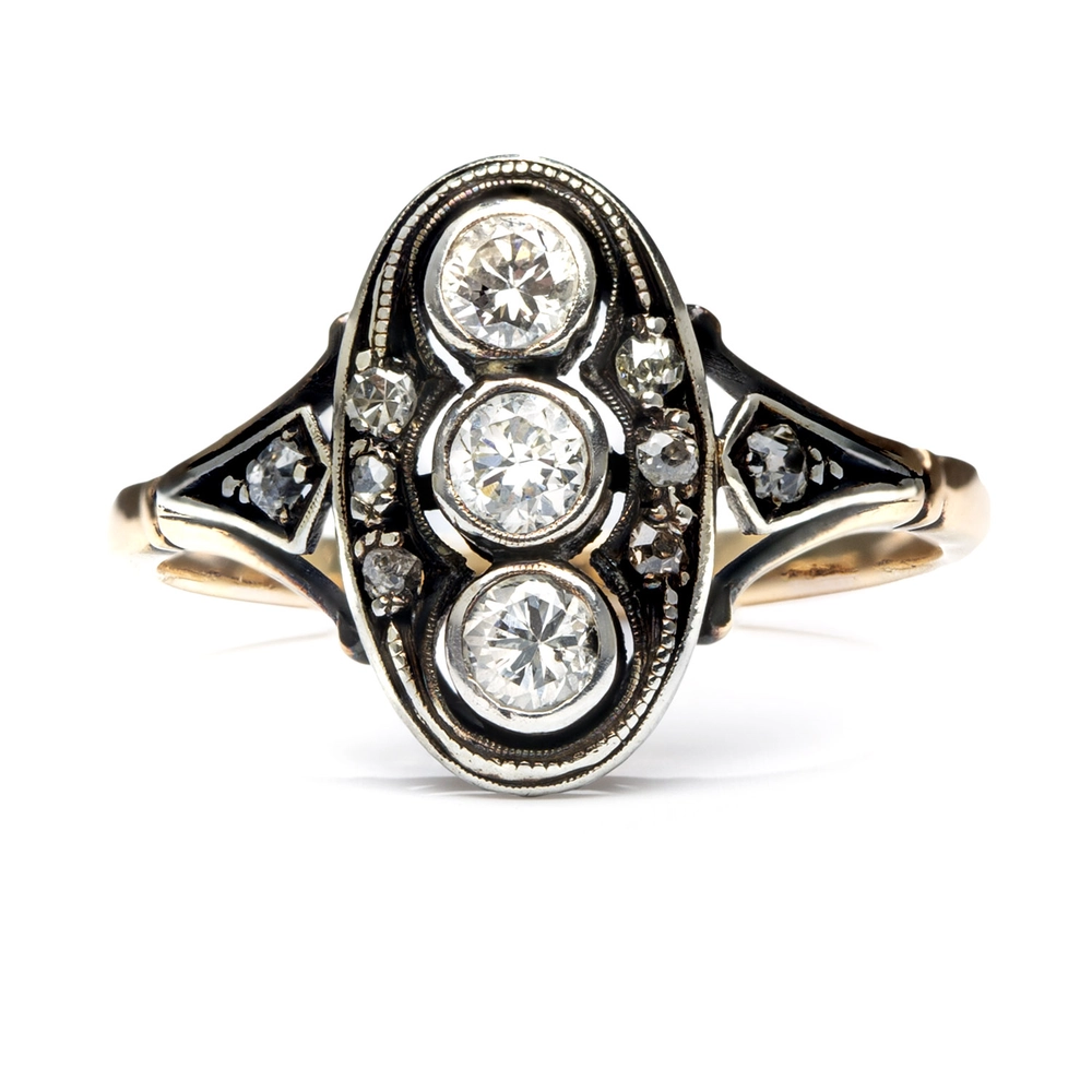 złoto pr. ~ 0,585, srebro (oprawa kamieni), 3 brylanty ł. ~ 0,45 ct K/VS-P, 8 diamentów ł. ~ 0,15 ct K/VS-P, masa: 3,69 g, rozmiar: 18*