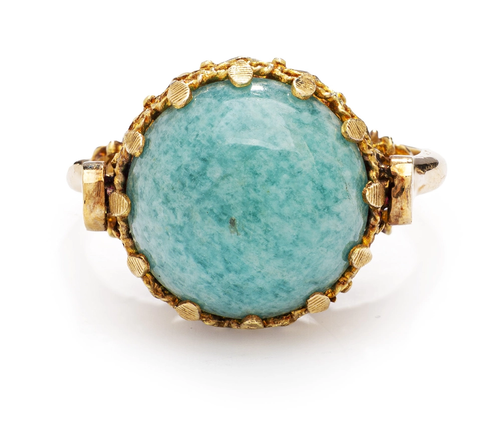 złoto pr. ~ 0,585, amazonit i karneol w formie obrotowej kuli o śr. 14 mm, masa: 7,62 g, rozmiar: 17*