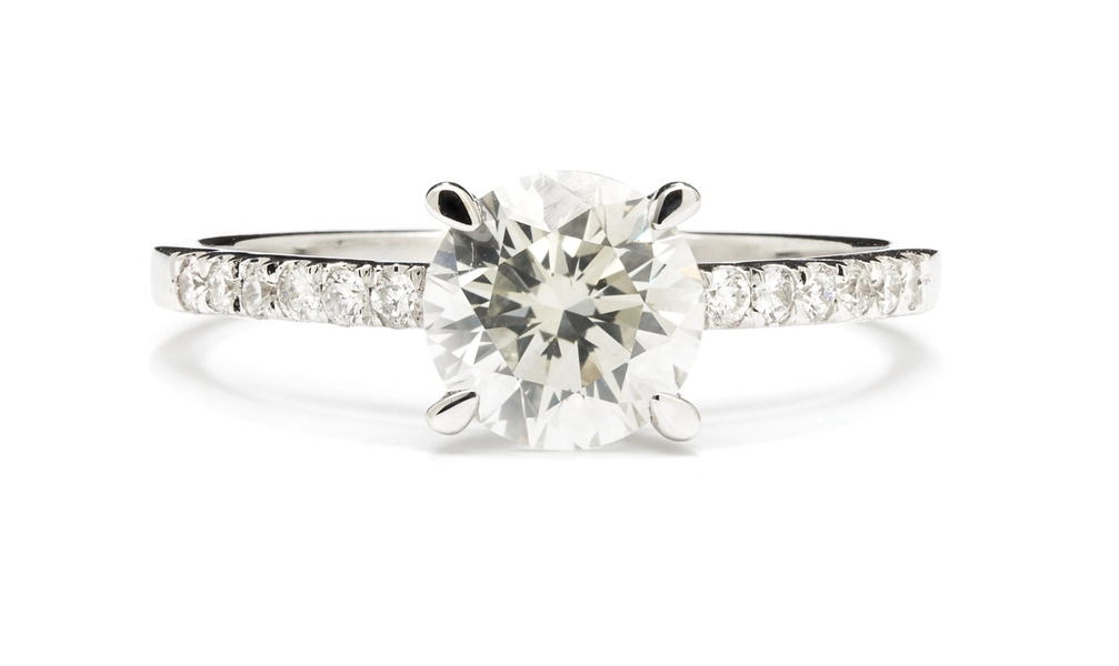 białe złoto pr. ~ 0,750, 1 brylant ~ 1,04 ct H/VVS2, 14 brylantów ł. ~ 0,14 ct D-F/VS, masa: 1,82 g, rozmiar: 11*