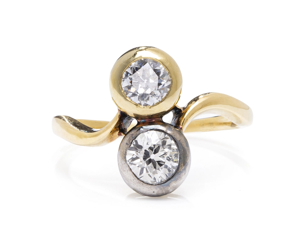 złoto pr. ~ 0,585, 2 brylanty ł. ~ 0,90 ct I-J/VS w starym szlifie, masa: 3,23 g, rozmiar: 11*