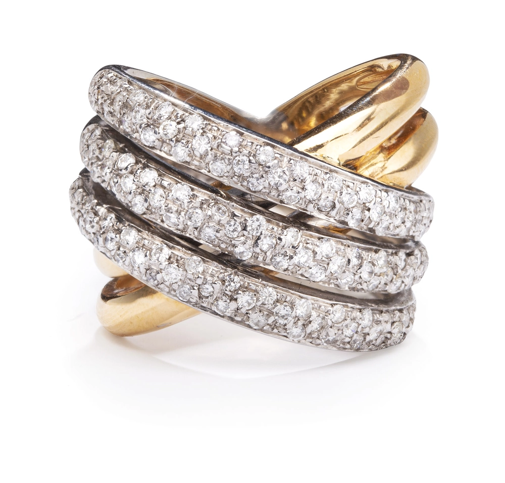 białe i żółte złoto pr. ~ 0,585, 129 brylantów ł. ~ 1,00 ct I/SI-P, masa: 14,28 g, rozmiar: 15