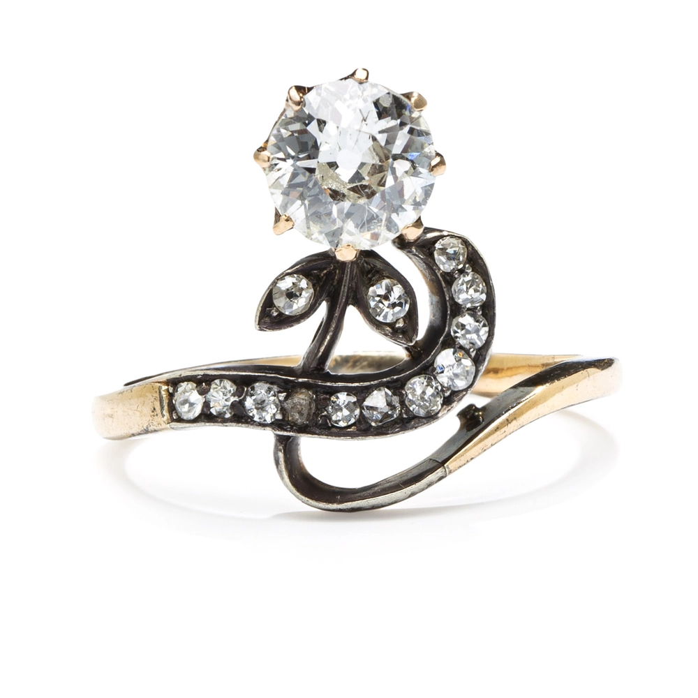 złoto pr. '56', lutowie z metalu nieszlachetnego, 1 brylant ~ 0,75 ct K/SI w starym szlifie, 13 diamentów ł. ~ 0,20 ct J/VS-P, rosyjska punca państwowa z lat 1908-1926, masa: 3,11 g, rozmiar: 14*