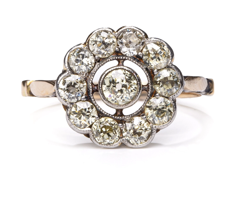 złoto pr. '3', 11 brylantów ł. ~ 1,20 ct M/VS-P w starym szlifie, warszawska punca probiercza stosowana w latach 1931-1963, złotnik 'SS', masa: 3,35 g, rozmiar: 13*