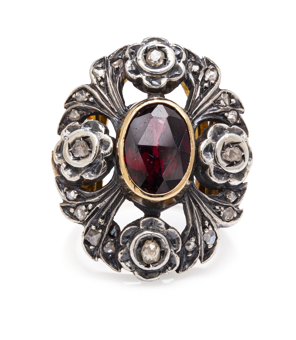 złoto pr. ~ 0,585, srebro, 1 granat o wym.: 11,5 x 8 mm, 20 rozet diamentowych ł. ~ 0,30 ct J/SI-P, masa: 14,85 g, rozmiar: 14*