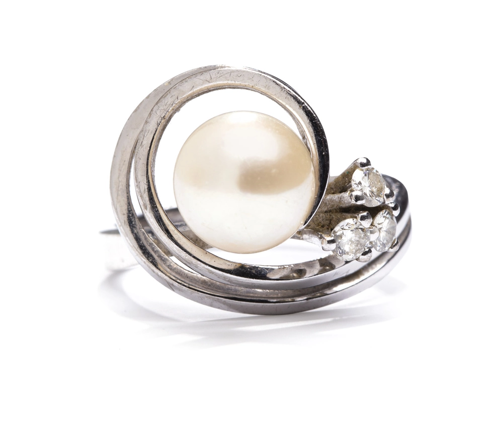białe złoto pr. ~ 0,750, 3 brylanty ł. ~ 0,20 ct I/VS, 1 perła hodowana Akoya o śr.: 9 mm, masa: 7,57 g, rozmiar: 17*