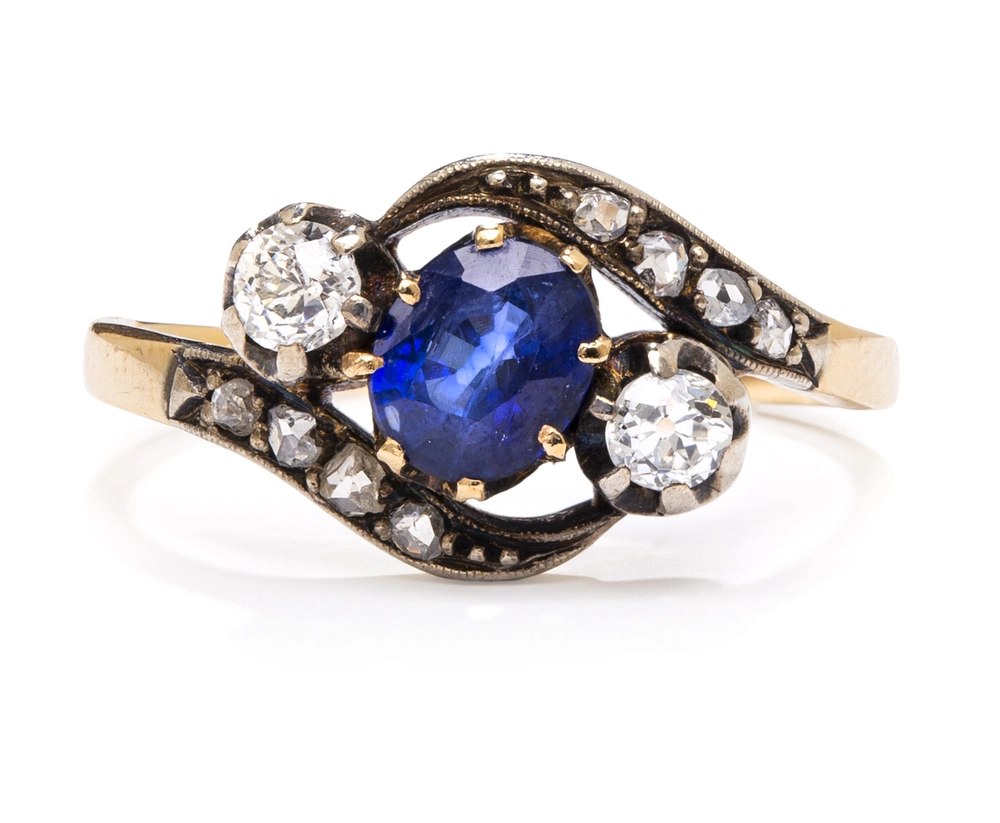 złoto pr. ~ 0,585, 1 szafir ~ 0,71 ct, 2 brylanty ł. ~ 0,20 ct I/VS w starym szlifie, 8 rozet diamentowych ł. ~ 0,05 ct J/VS-P, masa: 2,38 g, rozmiar: 12*