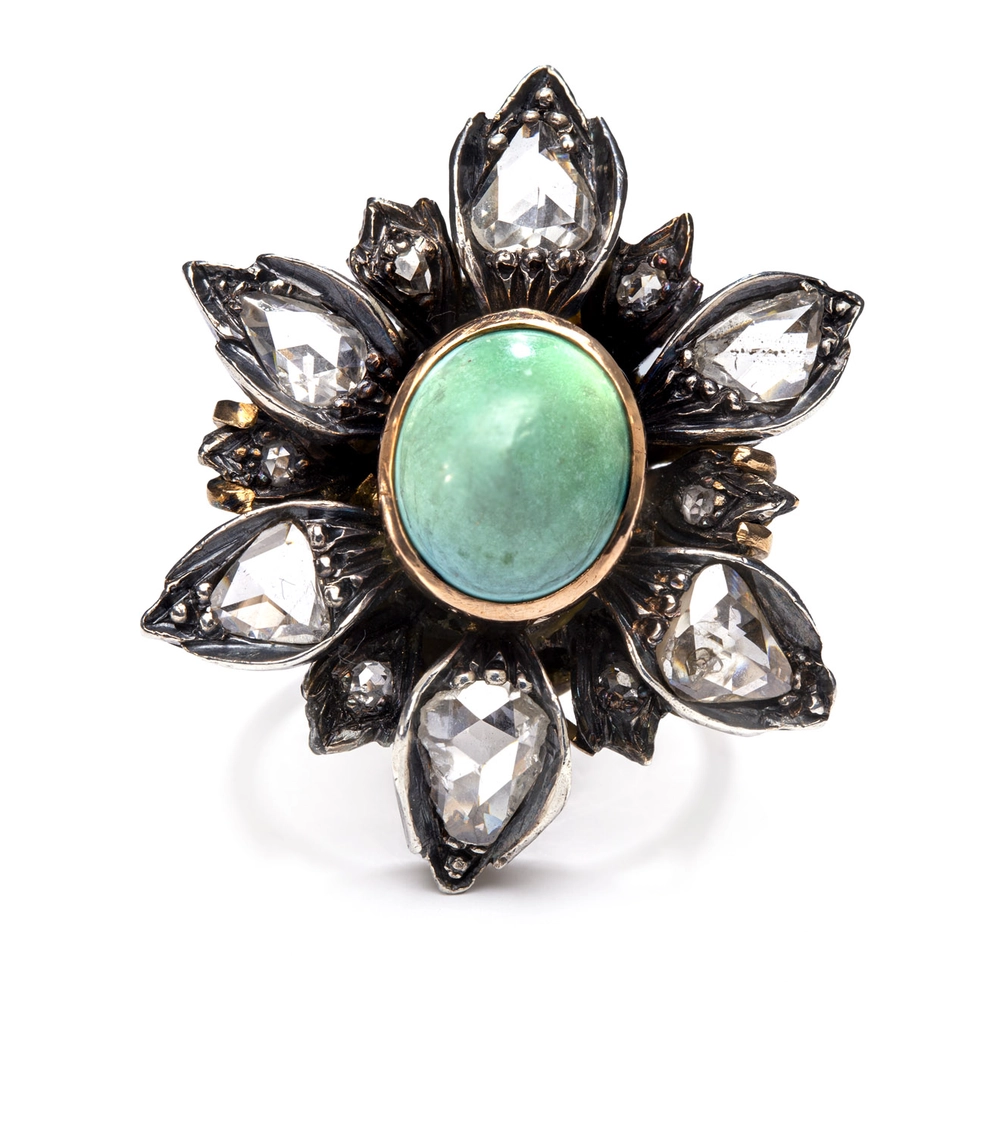 złoto pr. ~ 0,585, srebro, 12 rozet diamentowych ł. ~ 1,60 ct J/VS-SI, 1 turkus w szlifie kaboszon o wym.: 12 x 10 mm, masa: 15,55 g, rozmiar: 14*