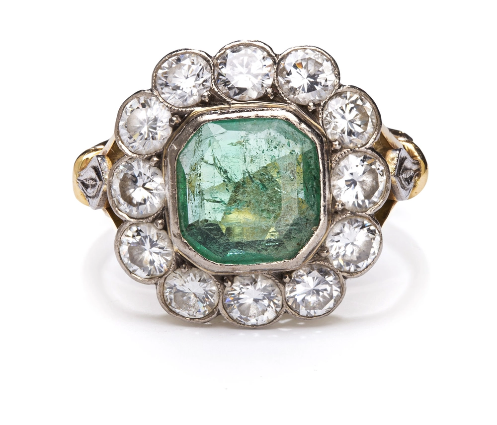 złoto pr. ~ 0,585, 12 brylantów ł. ~ 1,70 ct H/VS-SI, 1 szmaragd ~ 1,40 ct, masa: 6,05 g, rozmiar: 14*